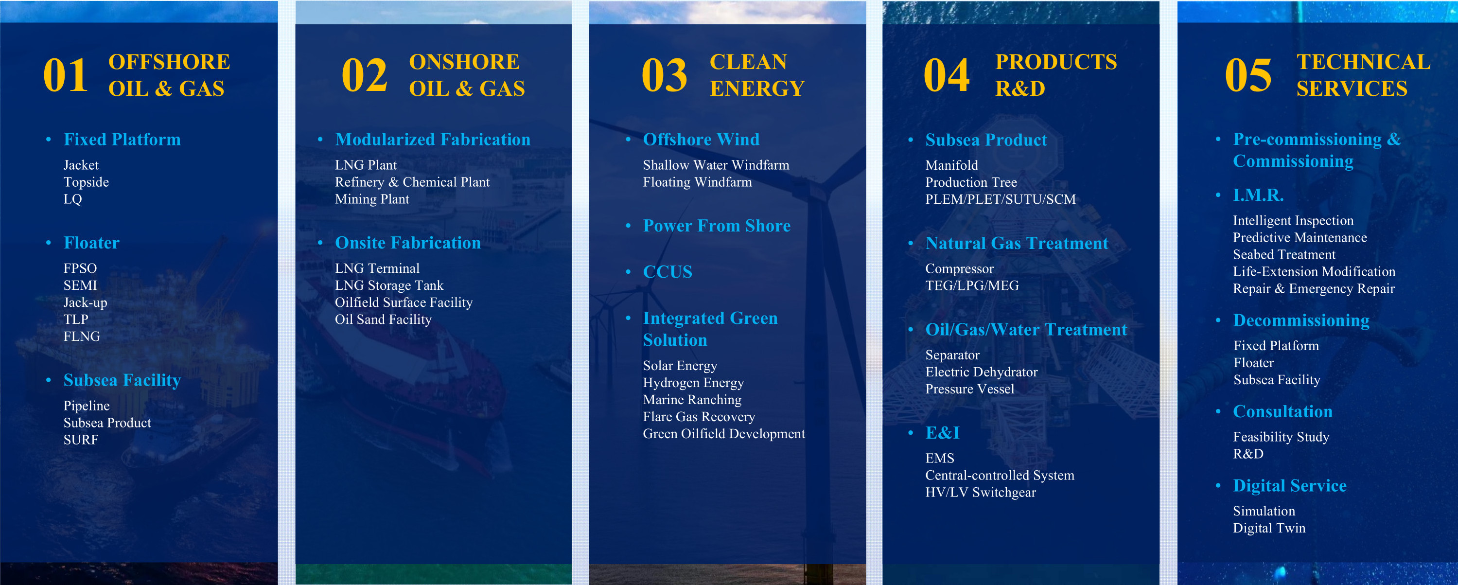 COOEC focuses on “Engineering+Product+Service” and provides the Full Life-cycle Solutions for oil & gas field development ranging from Feasibility Study, Pre-FEED, FEED, Detail Engineering, Procurement, Construction, Installation, Inspection, Pre-commissioning & Commissioning to IMR and Decommissioning.