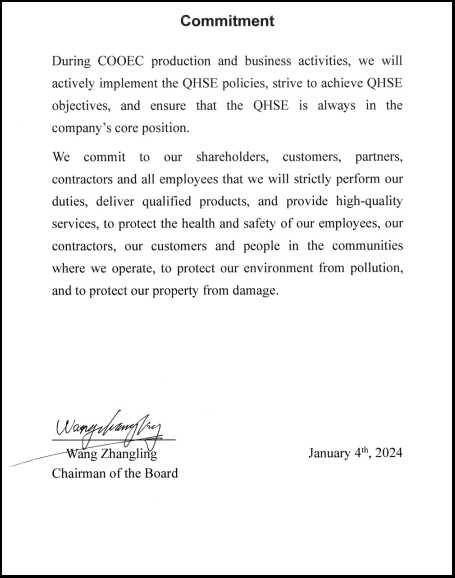 COOEC?is committed to fulfilling its social responsibilities?and upholding a systematic approach to management. We have?established an internationally certified QHSE (Quality, Health,?Safety, and Environmental) management system that prioritizes?risk control, propelling our QHSE?performance to the forefront of?the industry globally.?