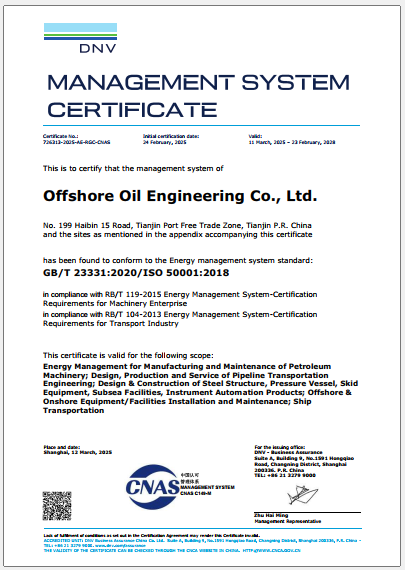 Offshore Oil Engineering Co., Ltd. is a listed company controlled by China National Offshore Oil Corporation. It is the only large general contracting company in China with capacities to undertake the design, procurement, construction, offshore installation, commissioning and maintenance of offshore oil and gas development projects, as well as the liquefied natural gas, offshore wind power, refining and chemical projects, etc. It is also one of the largest and the most competitive EPCI (engineering, procurement, construction and installation) contractors of offshore oil and gas projects in the Asia-Pacific region. The Company is headquartered in Binhai New Area, Tianjin. It was listed on Shanghai Stock Exchange (Stock Short Name: COOEC, Stock Symbol: 600583) on February 2002.