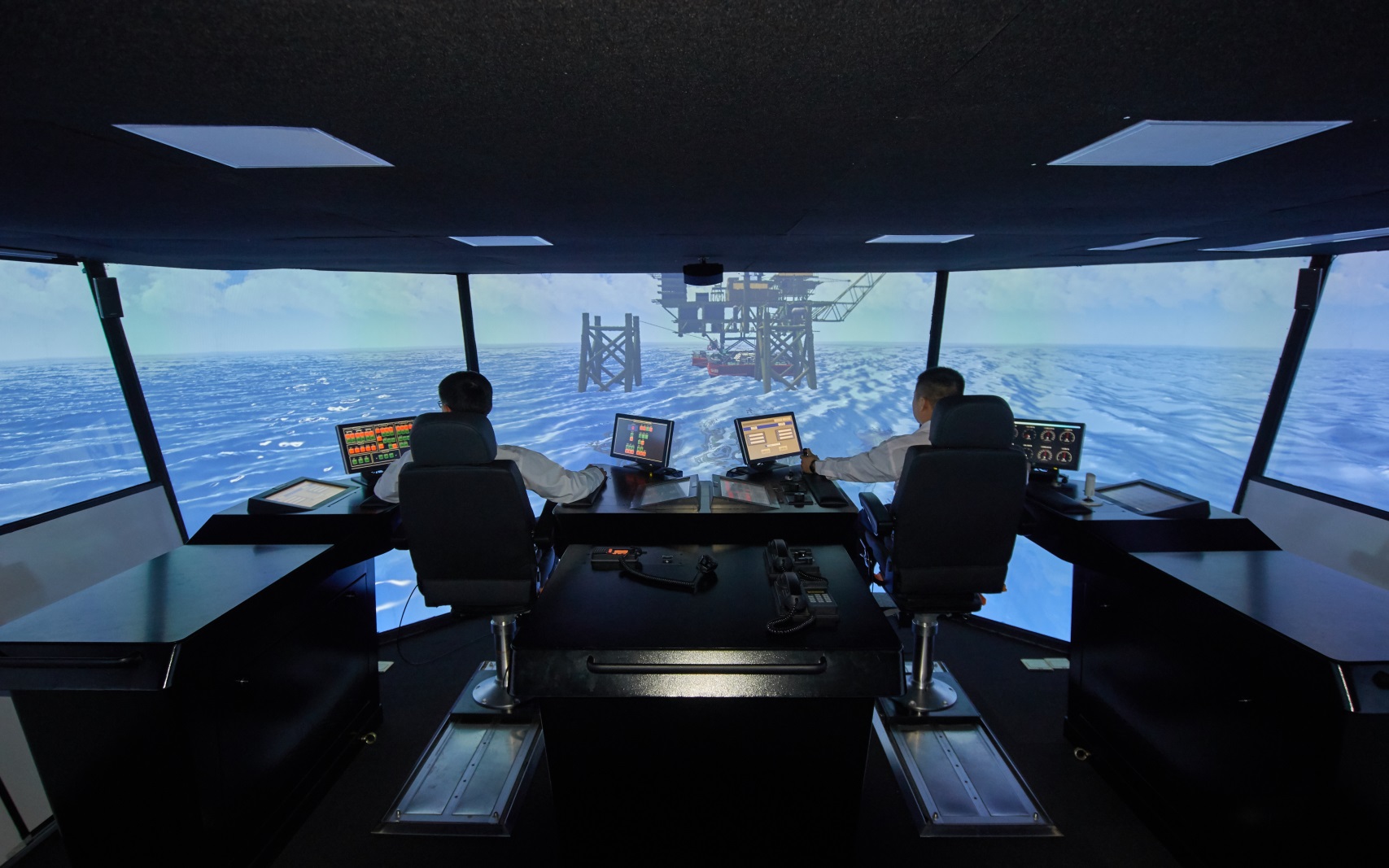 海洋工程作業仿真裝備包含深水鋪管起重作業仿真模擬器等專業模擬器十余套,以及360度環形投影球幕系統、四面CAVE投影系統等視景顯示裝備,具備海洋工程典型作業如單吊/雙吊起重、S型/J型鋪管、浮托安裝、錨系處理、水下安裝維修等作業類型的仿真模擬預演和人員培訓功能,并可開展多裝備多作業站位協同仿真。